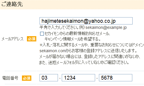<登録後、変更が可能です> メールアドレスと電話番号を入力します。 →登録後変更可能です。 セカイモンから最新情報お知らせメール、キャンペーン情報メールを希望する場合はチェックを入れます。 →登録後変更可能です。 電話番号を入力します。 |