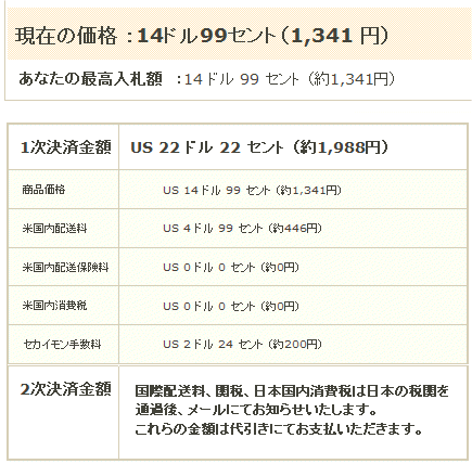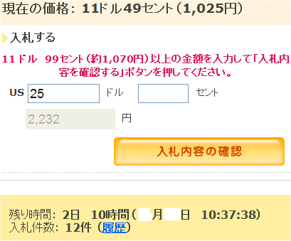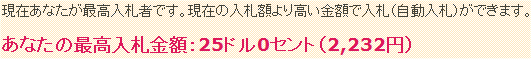 現在の入札価格は11,49ドルですが、落札価格予想を25ドルと設定し、見積もりを行ってみます。 落札予想価格2,232円、推定合計金額が4,798円。 なかなか良しと思うので、入札を実行します。 |