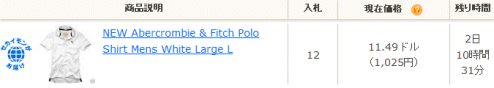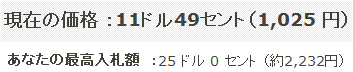 現在の入札状況が確認できます。 現在の価格は20ドル49セント。 25ドルまで自動入札中の状態です。 さらに高い金額でも入札が可能です。 |