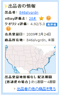 商品紹介ページの右側に出品者の情報が提示されます。 こちらの出品者はパワーセラーと表示されています。 パワーセラーとは、評価総数が100以上で98%以上の良い評価が必要で、出品者となってから3ヶ月以上、出品・落札がコンスタントにある方に与えられるebay内の称号です。 パワーセラーのハードルは非常に高く、商品を購入する際の出品者選びの信頼度の指針になります。 eBay評価点 - この出品者の基本評価になります。過去の落札者の出品者に対する取引評価が点数で表示されます。点数が多いほど取引数の実績が多く評価も高い傾向にあります。 クオリティ評価 - 過去の落札者の出品者に対する取引の質の評価です。「商品状態」「コミュニケーション」「配送期間」「送料と手数料」の項目ごとに評価されています。 この方は評価が大変良いようです。 次に総費用をチェックしてみましょう。 |