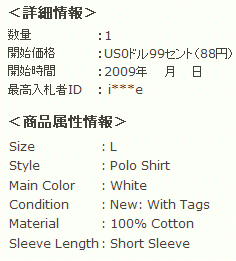 | ★━━━━━━━━━━━━━━━━━━━━━━━━━━━━★ セカイモン 入札受付完了(自動送信)メール ★━━━━━━━━━━━━━━ http://www.sekaimon.com/ ━★ いつもセカイモンをご利用いただきありがとうございます。 お客様の入札を、下記の通り承りました。 ■入札商品詳細 ━━━━━━━━━━━━━━━━━━━━━━━━━━━━ 商品ナンバー:************ 商品名:NEW Abercrombie & Fitch Polo Shirt Mens White Large L あなたの入札額:US25.00ドル(2,232円) 現在の価格:US20.49ドル(1,829円) 入札日時:2009-**-** 00:52:06 終了日時(日本時間) :2009-**-** 10:37:38 ━━━━━━━━━━━━━━━━━━━━━━━━━━━━ |