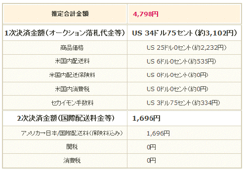 「この商品の総額見積もり計算機」をクリックします。 「総額見積もり計算機」の使い方はコチラ >>総額見積もり機能の使い方 1次決済費用が1,900円(購入時の支払い) 内訳 → 商品価格1,342円 / 米国内配送料446円 / セカイモン手数料200円 2次決済費用が1,701円(商品到着時の支払い) 内訳 → 国際配送料1,701円 このように総額の見積もり計算されました。 |