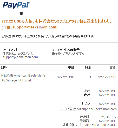 セカイモン運営会社の株式会社ショップエアラインへの支払い送金が完了したメールがPaypalより届きます。 |