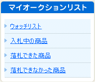 マイオークションリストでは興味がある(ウォッチリスト)商品、入札している商品、落札できた・落札できなかった商品を管理できます。 ウォッチリスト - 商品一覧、検索結果、商品ページで気になる商品を見つけたら、「ウォッチリストに登録する」ボタンをクリックすると、オークションの動きを確認することができます。 入札中の商品 - 入札中の商品一覧を表示します。オークションの動きを確認することができます。 落札できた商品 - 落札した商品一覧を表示します。配送中の商品の状況、支払の状況を確認することができます。 落札できなかった商品 - 落札できなかった商品を一覧表示します。 |