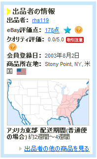 過去の落札者からの出品者評価、登録日、目安の配送期間を確認します。ここが一番重要なチェック項目です。 出品者の実績を確認するために、入札するにおいて出品者の評価は必ず目を通しておきましょう。 セカイモンが検品、商品未着の返金を行ってくれますし、神経質になりすぎることはありませんが、極端に評価の悪い場合や登録が最近の場合などは、事前に取引を控えた方が良いでしょう。 eBay評価点 - この出品者の基本評価になります。過去の落札者の出品者に対する取引評価が点数で表示されます。点数が多いほど取引数の実績が多く評価も高い傾向にあります。 クオリティ評価 - 過去の落札者の出品者に対する取引の質の評価です。「商品状態」「コミュニケーション」「配送期間」「送料と手数料」の項目ごとに評価されています。 <取引注意>の赤表示がある場合は過去の取引評価が高くないということです。取引には注意が必要です。 |