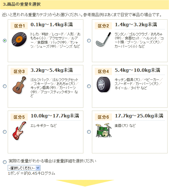 重量カテゴリから近いと思われる区分を選択します。実際の重量が分かる場合は下部のプルダウンメニューから選択します。 |