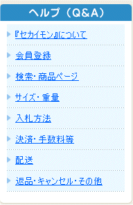 | ◇マイページの使い方 ◇入札前のチェック事項 ◇手数料・費用の内訳 ◇総額見積もり機能の使い方 ◇Paypal簡単入札 ◇サイズ・重量換算表 |