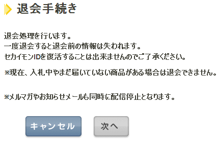 セカイモン退会手続き確認画面が表示されます。 ※入札中・届いていない商品がある場合は退会不可。 ※メルマガ・お知らせメールも退会と同時に配信停止となります。 「次へ」ボタンをクリックします。 |